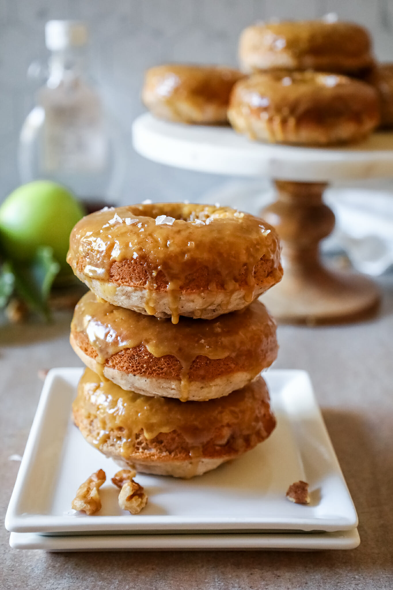 These Salted Maple, Apple + Walnut Gluten Free Doughnuts are loaded with shredded apples and toasty walnuts. The glaze is made with rich maple syrup and finished with a sprinkle of flaky sea salt.